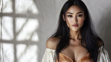 A woman with long dark hair poses gracefully showcasing a stylish outfit. Soft light filters through nearby windows highlighting her features and creating a serene atmosphere in the room.