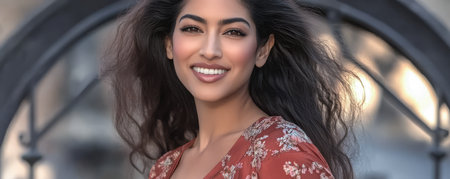 A young woman with long flowing hair smiles brightly while wearing a floral dress. The background features a decorative structure suggesting a lively and warm day in an urban environment.