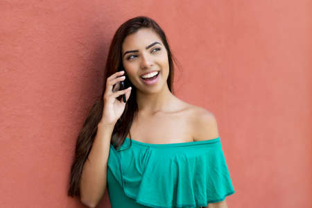 Laughing latin american young adult woman with long dark hair talking with boyfriend at mobile phone outdoor in summer