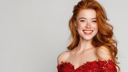 A cheerful young woman with long red hair showcases beauty and elegance in a vibrant red dress, radiating confidence and joy in a studio setting.