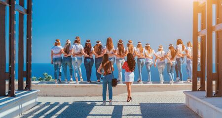 successful team of girls in white t-shirts and blue jeans take photos hugging each other on the sea background. Friendship, Teamwork, Harmony and Help Concept