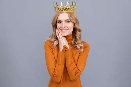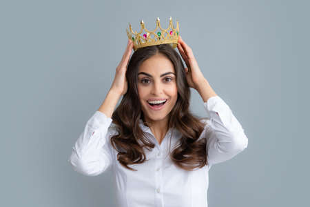 Young woman queen wear golden crown, isolated gray background.