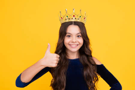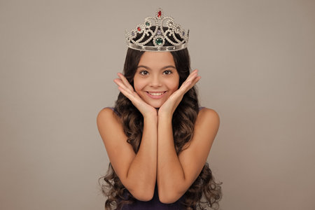 Girls birthday party, funny kid in crown. Imagine herself a queen, child wear diadem. Successful teenager wear luxury beauty queen crown, success. Happy face, positive and smiling emotions.