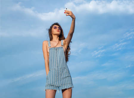 Denim girl. Woman in jeans dress. Beauty and fashion. Sexy girl woman in sunglasses with long hair.