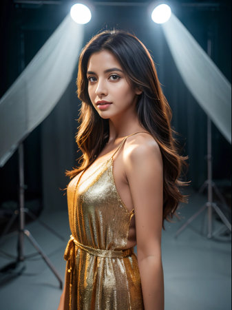attractive asian woman in golden dress looking at camera in studio