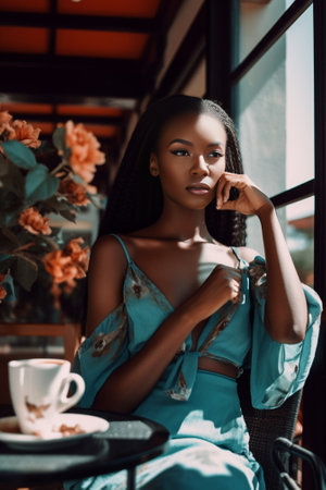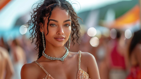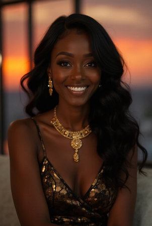 young attractive and glamorous African American black woman in chic and elegant summer dress posing relaxed on summer sunset beach in holiday vacation and beauty lifestyle concept