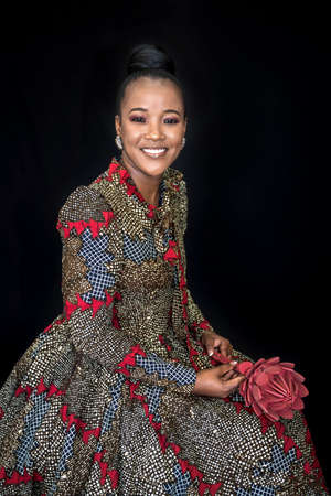 African female wearing shweshwe dress