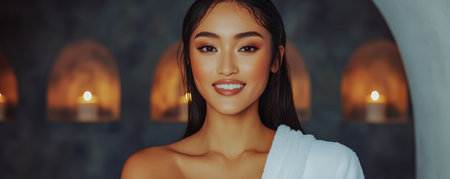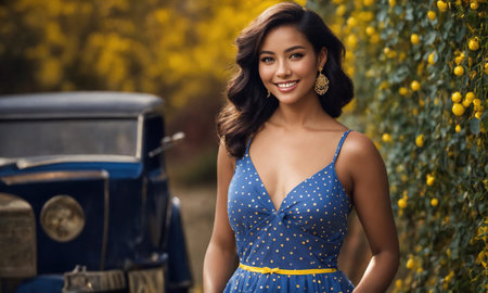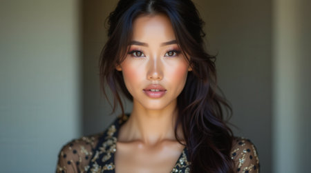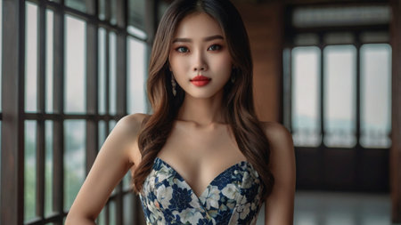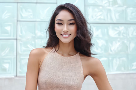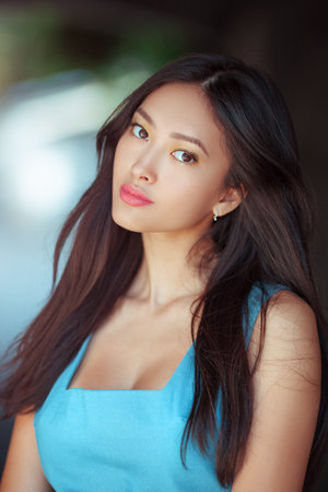 Elegant Asian Woman With Long Hair and Radiant Skin in Blue Dress