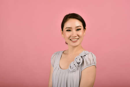 Asian woman relaxing on pink background, Portrait of happy smiling middle age woman in casual clothes looking at the camera.