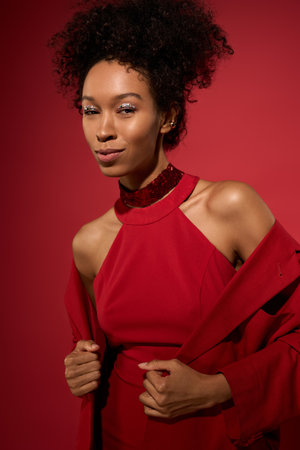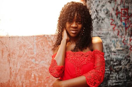 Stylish trendy afro france curly woman posed at autumn day in red dress. Black african female model.