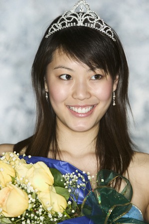Young beauty pageant winner holding a bouquet of flowers smiling