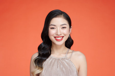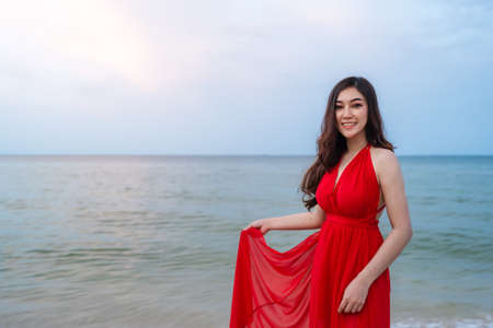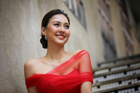 Young Asian Woman in a beautiful red dress looking at camera with smile. Fashion model, bride or pre-wedding concept.