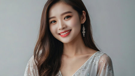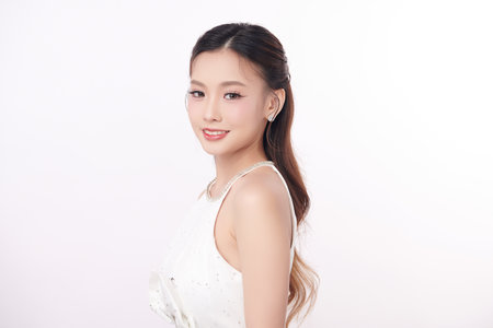 A beautiful young Asian woman with clean, fresh skin against a white background. Skincare, facial treatment, cosmetology, beauty, and spa. An elegant portrait of an Asian woman.