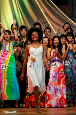 Jakarta, August 8, 2009. One of the winner of Atrium Model Competition 2009 walk to the front with the support of her fellow competitors.