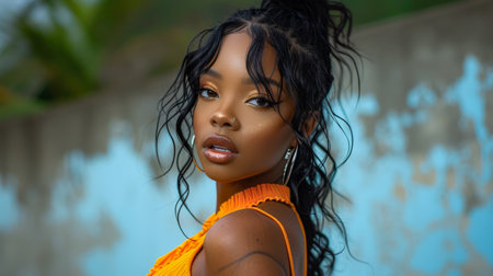 Photo of a stylish young black woman with curly hair wearing orange crop top walking in the street
