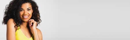 portrait of happy african american woman holding colorful beads and looking at camera isolated on grey, banner