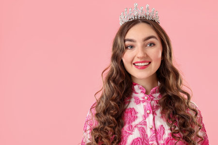 Beautiful woman wearing luxury crown on pink background, space for text