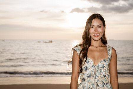 attractive asian beautiful female woman long hair casual summer cloth pink color dress smiling cheerful freshness morning moment carefree lifestyle travel vacation moment