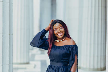portrait of beautiful young african american woman in blue dress with pink hair hairstyle smiling and walking down the street