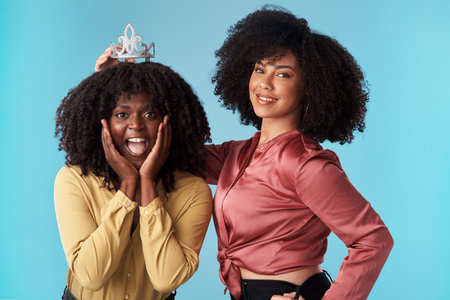 Were all winners when we support each other. Studio shot of a young woman putting a crown on her friend against a blue background.