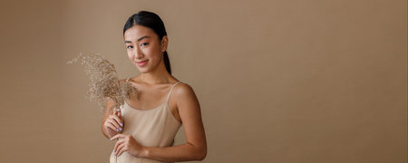 Asian young woman with plant standing in studio