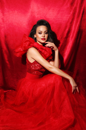 fashion holiday photo of beautiful sexy woman with dark hair in luxurious red dress posing in red studio