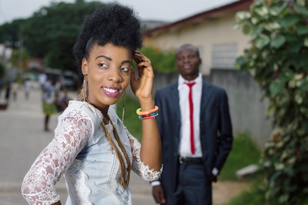 Young woman looking back and admired by her man in the street