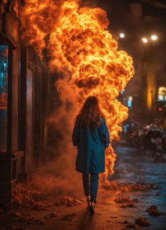 Woman standing in field with huge fire explosion and smoke behind her.