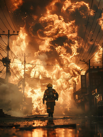 Firefighters battling blaze, intense flames, teamwork in action, heroic atmosphere