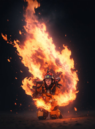 Asian firefighter against a backdrop of fire. Heroic female firefighter confronting a conflagration. Concept of heroic action, emergency service, fire combat, and public protection. Copy space