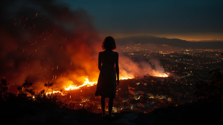 An AI generated illustration of a female overlooking a large open field covered in smoke and flames