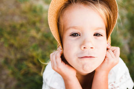 Portrait of a little blonde girl in the countryside. Concept of children in nature