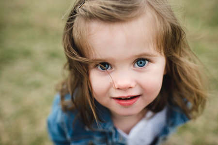 Portrait of a blue-eyed toddler girl playing outside