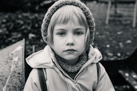 portrait of a cute little girl with a serious facial expression looking to the side and up