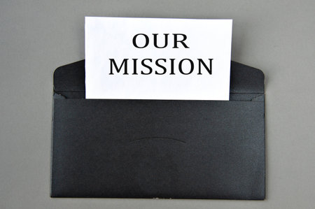 OUR MISSION - words on white paper on a black envelope with a magnifying glass. Info concept