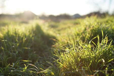 Green grass in the field at sunset. Shallow depth of field.