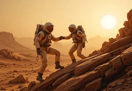 Two astronauts in spacesuits, likely on Mars, are shown climbing a rocky slope. Generative Ai
