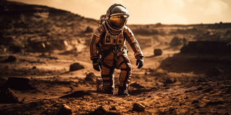 Astronaut in space suit on martian surface at day light, neural network generated image