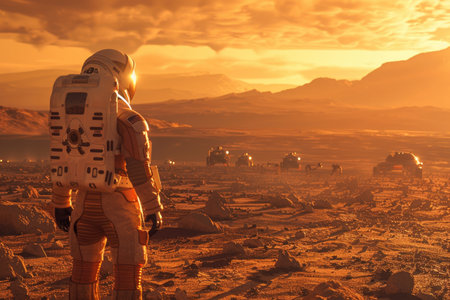 Astronaut standing on mars looking at a beautiful sunset