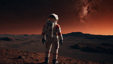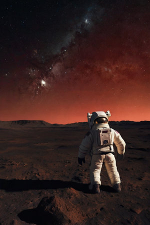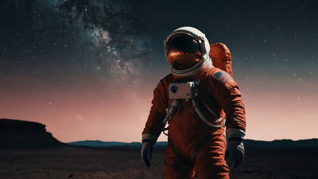 Astronaut on the planet Mars in the starry night.