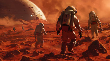 A group of astronauts walks on the reddish surface of Mars, with spacecraft nearby and a large planet visible in the sky.