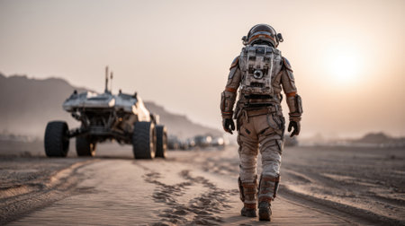 An astronaut walks along a dusty path in a desolate terrain during sunset. A futuristic rover is parked nearby, showcasing an advanced mission exploration on another planet.
