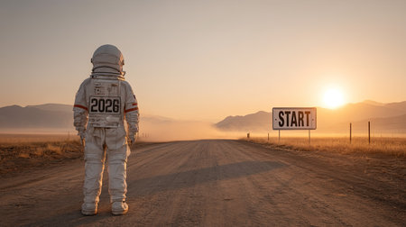 An astronaut stands on an empty road at sunrise, facing a distant sign that reads START. The scene evokes feelings of adventure and exploration, symbolizing new beginnings.