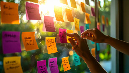 Closeup of a glass window covered with assorted sticky notes orange, purple, teal filled with creative ideas and doodles, sunlight streaming through, blurred coworker hands out of focus adding more notes