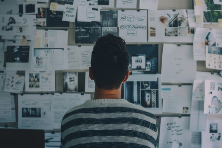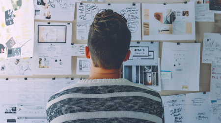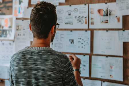 Man in glasses reviewing mood board with various designs and ideas, working on creative project in a modern office space