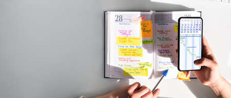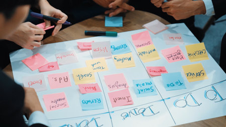 Close up of professional business team hands writing and putting sticky note on scrum task board. Top view of project manager write task and use kanban board to manage time and workflow. Directorate.