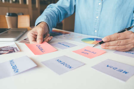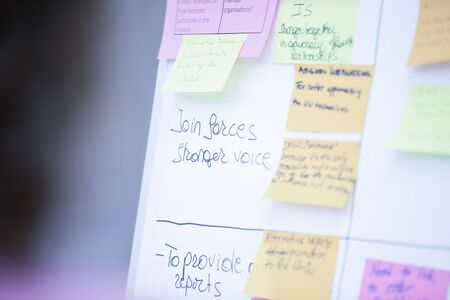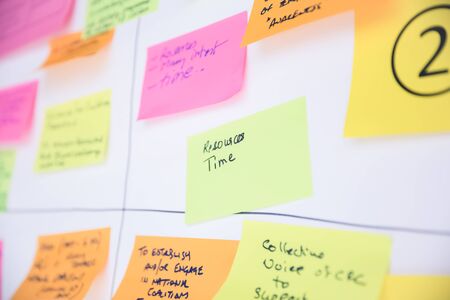 Web designer brainstorming for a strategy plan. Colorful sticky notes with things to do on office board. User experience (UX) concept