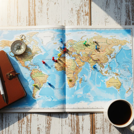 A captivating flat lay of travel essentials displayed on a rustic wooden table. The world map, camera, notebooks, and glasses create a perfect setting for planning adventures.