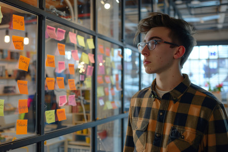 Young professional deeply contemplating diverse ideas posted on a glass wall in a modern collaborative space