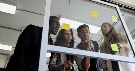Business team group meeting with sticky post on mirror glass board to brainstorming and sharing new idea in office